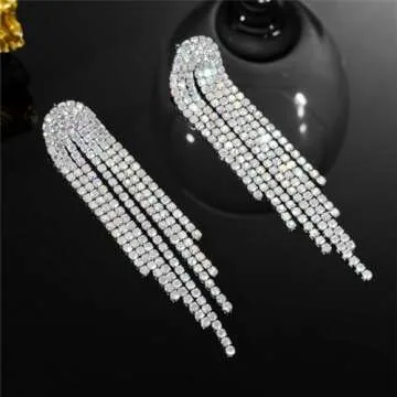 Show moreIntroducing our exquisite Rhinestone Tassel Earrings, designed to elevate any outfit with their stunning sparkly appeal. Crafted with top-notch workmanship and premium materials, these earrings showcase a perfect blend of charm and sophistication. Their long tassel design, measuring 3.4 inches in length and 0.6 inches in width, makes them a show-stopping accessory for weddings, parties, or any special occasion. Weighing just 8 grams per pair, you can enjoy wearing these dangle earrings from day to night without discomfort, making them a must-have addition to your jewelry collection.