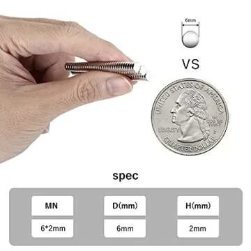 Show moreDiscover the magic of tiny power with these high-performance tiny magnets, a product designed for versatility and strength. These magnets measuring just 6mm in diameter and 2mm in height pack a punch with their superior magnetic flux density, offering an exceptional holding power that defies their small size. Whether you're an artist, a DIY enthusiast, or simply looking to organize your space, these magnets cater to a variety of needs.