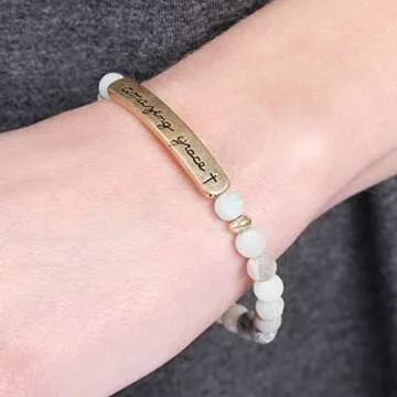 RIAH FASHION Cross Metallic Bar Beaded Stretch Bracelet - Religious Christian Strand Natural Stone, Sparkly Crystal Prayer Cuff Bangle (Amazing Grace - Amazonite)
