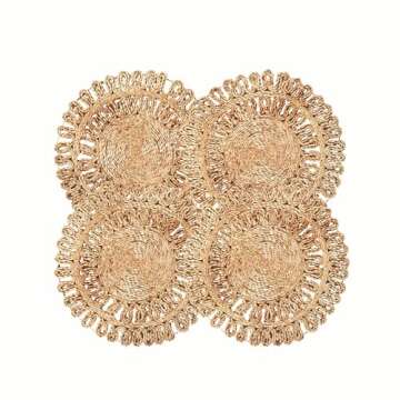 Show moreExperience the perfect blend of style and functionality with the RIANGI Natural Jute Braided Placemat Set. This exquisite set includes four 13-inch woven placemats, designed to elevate your dining experience, whether it’s an everyday meal or a special occasion. Crafted from eco-friendly 100% natural jute, these placemats not only protect your tables from scratches and heat but also lend a sophisticated, rustic charm that complements any décor. Their round shape and intricate handwoven patterns make them a versatile addition to both formal dining setups and casual family gatherings. The elegant design is sure to impress your guests, making every meal a memorable one.