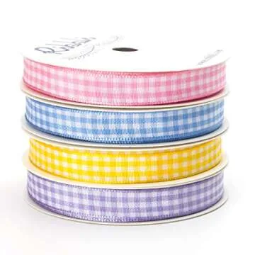 Show more Introducing the Ribbli 4 Rolls 3/8 Inch Gingham Ribbon, your go-to choice for transforming any project into a delightful masterpiece! These vibrant rolls, each 10 yards long, total an impressive 40 yards of exquisite ribbon, designed meticulously from 100% polyester. Available in charming colors including light pink, light blue, light purple, and yellow, this ribbon adds a playful yet elegant touch to any occasion.