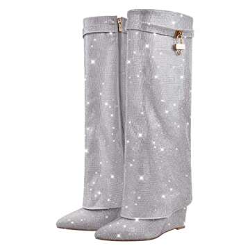 Show moreStep into the spotlight with Richealnana Women's Rhinestones Pointed Toe Wedge Boots, designed to elevate your fashion game. These knee-high fold-over boots feature a stunning 120mm (4.72 inches) wedge heel that beautifully combines style and comfort, making them the perfect choice for any special occasion or day out. Crafted from man-made, vegan-friendly materials, they hold an irresistible charm, adorned with sparkly crystals that catch the light and turn heads. Whether you're hitting the dance floor at a party, making an impression at prom, or just adding a glam touch to your daily attire, these boots offer limitless versatility.