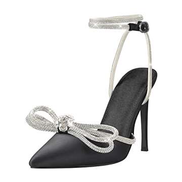 Show moreStep into elegance with the Richealnini Women's Pointy Toe Satin High Heeled Rhinestone Bowknot Pumps. Perfectly crafted for those special occasions, these stunning sandals feature a sleek, pointy toe design that elongates the legs while the high stiletto heel adds a touch of allure. Made from premium satin, the soft texture complements the dazzling rhinestone bow that adorns the front, showcasing your exquisite taste. The adjustable ankle buckle strap ensures a secure fit, making them a reliable choice whether you're dancing the night away or attending a formal gathering.