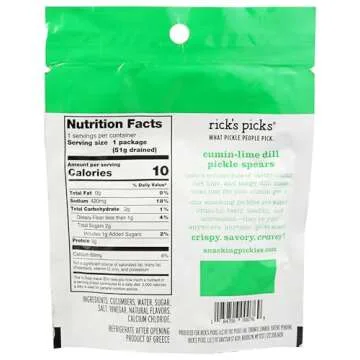Show moreIntroducing the RICK'S PICKS Cumin Lime Dill Snacking Pickle Spears - a tantalizing treat that adds zest to your snacking experience! These pickles are not just a side dish; they are a delightful culinary adventure. Each 2.2 oz jar is packed with crisp, crunchy spears that combine the classic taste of dill with a unique twist of cumin and lime. The balance of flavors makes these pickles perfect for straight out of the jar snacking or as an adventurous addition to your salads and sandwiches.