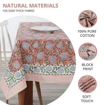 Measuring a generous 60x60 inches, this versatile tablecloth is ideal for both indoor and outdoor settings, perfect for casual picnics or formal banquets alike. Its vibrant Dark Salmon hue and floral handblock print make it a chic centerpiece that instantly enhances your decor, transforming any simple table into a beautiful focal point of color. Imagine hosting family dinners or special gatherings, where this tablecloth becomes the fabric of cherished memories, striking a harmonious balance between elegance and comfort.