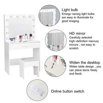 Show moreTransform your beauty routine with the exquisite Riforla Vanity Set with Lighted Mirror. This modern makeup vanity dressing table is designed not just for functionality but also for aesthetics, seamlessly blending into your bedroom or changing area. Featuring a huge mirror surrounded by 12 dazzling LED bulbs, it provides high brightness that allows you to apply makeup with precision and confidence. The sleek and simple design is complemented by a large capacity drawer, optimized for organizing everything from your favorite jewelry to countless cosmetics. Designed for those who appreciate both style and convenience, this vanity set is a centerpiece that enhances your personal space while offering unrivaled practicality.