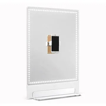 Show more Introducing the RIKI Tall Mirror, the ultimate LED lighted makeup mirror that revolutionizes your beauty routine! Designed with a sleek and modern aesthetic, this mirror features a powerful vanity ring light that provides perfect, even illumination for makeup application and content creation. Its special magnification mirror allows you to zoom in on your finest details, making it easier to create flawless looks. Equipped with internal magnets, the included 5x magnifying mirror and phone clip securely attach to the main mirror, ensuring you have everything at your fingertips while you glam up.