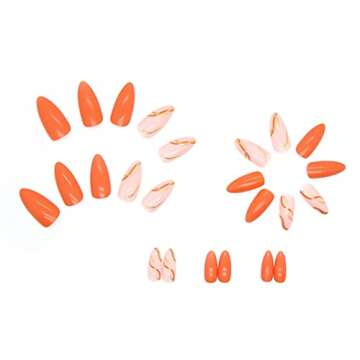 RikView Almond Press on Nails Medium Length Fake Nails Orange Nails with Swirls Design Glossy Nails for Women and Girls