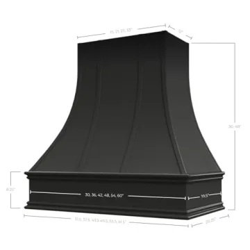 Show moreElevate your kitchen's aesthetic with the Riley & Higgs Curved Front Black Range Hood Cover! This stunning range hood cover, crafted from high-quality solid plywood and maple veneer, is designed to be not just functional but an exquisite centerpiece for your culinary space. Its sleek black finish, combined with decorative strapping and elegant crown molding, makes it a perfect fit for various decor styles, from rustic farmhouse to contemporary elegance. The ideal combination of durability and sophistication, this custom-made range hood cover will transform your kitchen into a stylish cooking haven.