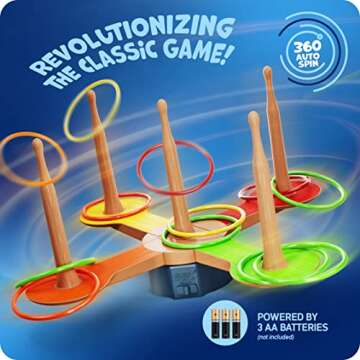 Show moreIntroducing the Ring Toss Game for Kids - the innovative way to experience a classic game with a modern twist! The 360° Spin Revolution ensures non-stop action, as the game automatically rotates, offering an exhilarating challenge that can't be found in traditional ring toss sets. It's perfect for players of all ages, making it an ideal addition to gatherings and family fun. Easy to set up and highly portable, you can bring this thrilling game wherever you go, whether it's in your backyard, at the beach, or on camping trips.