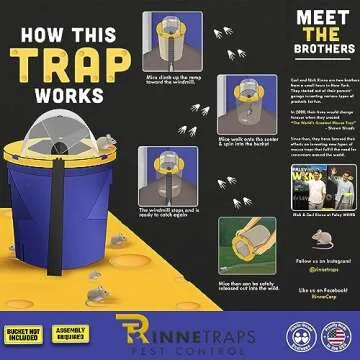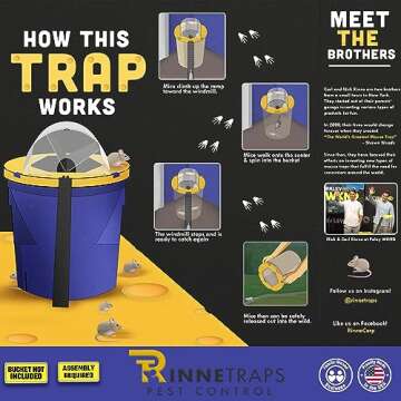 Show moreIntroducing the RinneTraps Dizzy Dunker Bucket Lid Mouse Trap, the innovative solution to your rodent problems, expertly crafted by renowned mouse trap expert Shawn Woods. Designed with both efficacy and humane treatment in mind, this trap presents a revolutionary approach to catching mice without the use of harsh chemicals or dangerous springs. Made in the USA, the Dizzy Dunker is not just about catching mice; it's about offering a smart, safe, and eco-friendly solution to pest problems in your home or garden.