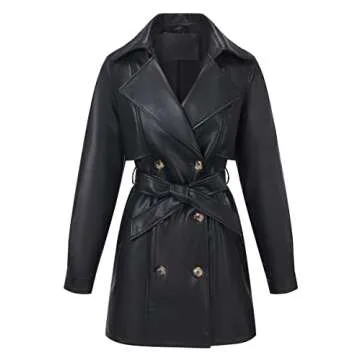 RISISSIDA Women Faux Leather Long Jacket Double Breasted, Vegan Pleather Mid Length Coats with Belt Black S