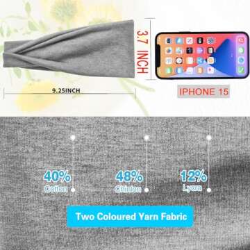 Show moreIntroducing the RITOPER Headbands for Women, where comfort meets style in a seamless blend. Crafted from a luxurious fabric composed of two different hues of yarn, this headband incorporates 40% Cotton, 48% Chinlon, and 12% Lycra for ultimate softness and breathability. Designed to fit women with a circumference range of 19.6 to 23.4 inches and a wide band of 3.92 inches, these headbands are not only aesthetically pleasing but also provide a perfect fit for most head sizes. Whether you're heading to a yoga class, going for a run, or just enjoying a lazy Sunday, these lightweight and breathable headbands ensure that every day is a good hair day.
