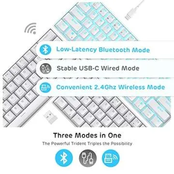 Show more The RK61 Mechanical Keyboard is a game-changer for anyone seeking a compact yet powerful typing experience. With its innovative triple mode connectivity, you can effortlessly switch between wireless Bluetooth 5.0, 2.4GHz dongle, and USB-C wired modes, ensuring a stable connection across your devices. This 60% mechanical gaming keyboard features 61 keys, designed meticulously for those who love an organized workspace without compromising functionality.