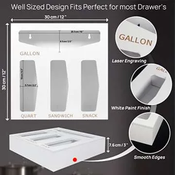 Show moreTransform your kitchen storage with the RNOONY Food Storage Bag Organizer, a stylish and functional solution for all your food storage needs. Designed with both elegance and practicality in mind, this organizer features a gorgeous heavy bamboo structure covered in a sleek white finish, ensuring it complements any kitchen decor while remaining durable. With four distinct slots, it can accommodate various bag sizes including gallon, quart, snack, and sandwich, allowing for effortless access and organization. The unique engraved labels on the lid not only enhance the aesthetic appeal but also enable you to identify the type of bags you need at a glance.