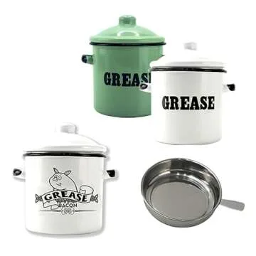 Roadmap 1.5L White Enamel Bacon Grease Container with Strainer, Grease Canister with Letter Pattern, Bacon Grease Saver, Oil Storage Jar, Kitchen Accessories for Farmhouse Kitchen Decor