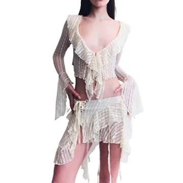 ROAONOCOMO Women Lace Patchwork 2 Piece Skirt Set Y2K See Through Fitted Crop Tops Low Waist Bodycon Skirt Outfit Streetwear I-beige