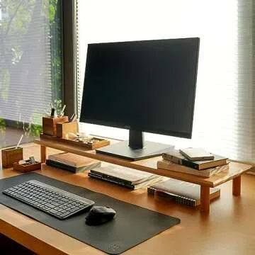 Show more Transform your workspace with the sophisticated and stylish Rocdeer Dual Monitor Shelf, designed for both functionality and aesthetic appeal. Crafted from 100% natural bamboo, this eco-friendly monitor riser not only elevates your computer screen but also brings an artistic touch to your office environment. With its minimalist design, it seamlessly fits any décor while providing essential storage beneath, perfect for organizing your keyboard, mouse, or other essentials.