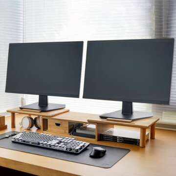 ROCDEER Dual Monitor Stand Riser with Drawer for Desk Laptop Desk Shelf with Adjustable Length and Angle, Bamboo Computer Stand Riser for 2 or 3 Monitors Screen Laptop PC TV -Natural
