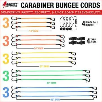 Show more Introducing the Rocket Straps Bungee Cords, an exceptional product developed by a dedicated American family-owned business. These bungee cords are meticulously made from triple braided polyethylene terephthalate (PET), paired with premium-grade rubber that enhances both durability and functionality. Tailored for various fastening requirements, whether you need to secure loads on a truck or neatly organize tools in your garage, these cords rise to every occasion with zeal.