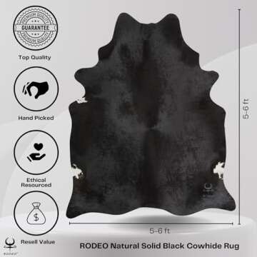Show moreTransform your space with the exquisite Rodeo Genuine Cowhide Rug, a hand-picked masterpiece designed to enhance your home’s aesthetic appeal. Measuring approximately 6x7 ft, this stunning black cowhide rug is crafted from authentic, premium cowhide, showcasing its unique natural patterns that make each piece one-of-a-kind. Imagine the charm and elegance it can bring to any room in your home, from living rooms to bedrooms, effortlessly elevating your decor while providing an inviting atmosphere.