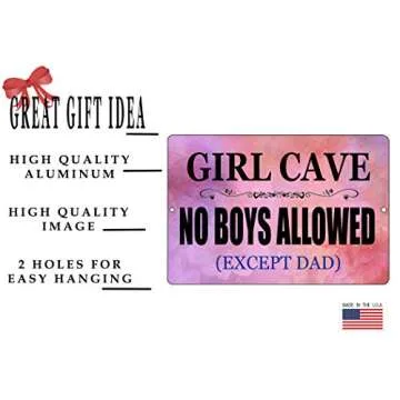 Show moreWelcome to the perfect statement piece for any young girl’s sanctuary - the Rogue River Tactical Funny Girl Cave Metal Tin Sign. Measuring 12" x 8", this vibrant pink sign exclaims "No Boys Allowed" in a humorous and whimsical font, making it an ideal decoration for a bedroom door or wall. Crafted from durable aluminum, this sign is designed to withstand both indoor and outdoor conditions, ensuring it remains a cherished part of your child’s personal space for years to come. Proudly made in the USA, it symbolizes not just decoration but a celebration of individuality and personality.