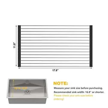 Show more Introducing the ultimate kitchen companion that will revolutionize your cooking experience! This roll-up dish drying rack measures 11.8 inches in length and 17.8 inches in width, ensuring it fits perfectly over sinks up to 16.8 inches. Crafted from 19 pcs of food-grade stainless steel pipes with a reliable silicone coating, it promises durability and strength, making it a safe choice for all your kitchen needs. Not only is it ideal for drying dishes and cups, but this multifunctional rack also doubles as a heat-proof mat, capable of withstanding temperatures up to 400°F. Perfect for protecting your countertops from hot pans!