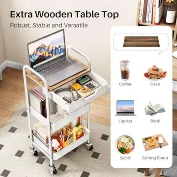 Rolling Utility 3 Tier Cart with Wheels - Versatile Slide Drawer and Wood Tabletop, White