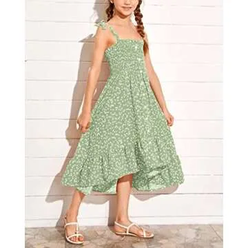 Rolmama Girls Summer Dress Kids Sleeveless Tie Strap Boho Beach Midi Dress Smocked Ruffle Flowy Sundresses Green