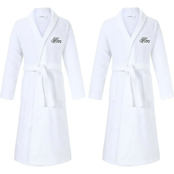 Show moreExperience the unmatched comfort and luxury of our terry cotton bath spa robes, meticulously crafted to deliver both style and functionality. This set of two robes is not just any ordinary set; it features beautifully stitched 'HERS and HERS' monograms, making it a unique and thoughtful gift for couples. Made from 100% cotton and imported for superior quality, these robes promise exceptional absorbency and plush softness with a 650 GSM rating. The tie closure ensures a perfect fit for most, while the machine-washable material makes it easy to maintain its pristine condition. With a 45 inches shoulder-to-hem length and 21 inches sleeves, these robes are designed to wrap you in comfort and warmth.