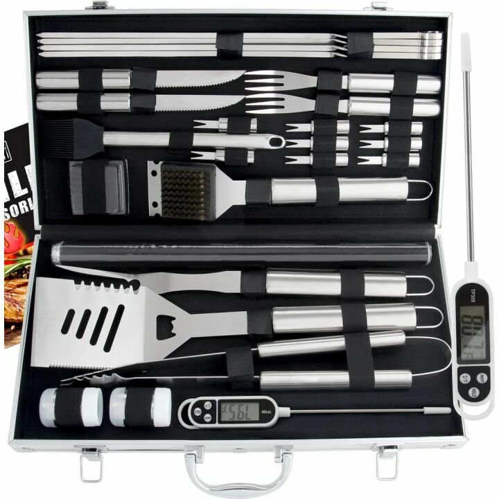 What sets this BBQ set apart is its inclusive design that incorporates every utensil one might need to handle any grilling task with ease. The dual protection against rust and heat ensures each piece withstands long-term use. Further, the sleek aluminum case makes it not only easy to transport but also great for safe storage.