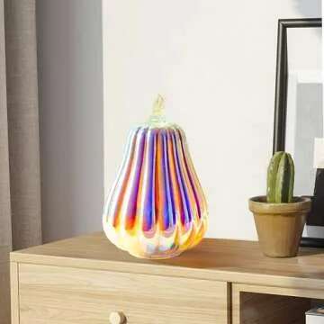 Show moreIntroducing the Romingo Lighted LED Mercury Glass Pumpkin, a stunning autumn decoration that seamlessly blends vibrant beauty with functionality. Measuring at 8.5 inches, this exquisite piece is designed to enhance your seasonal decor with its beautiful light reflection through colorful pumpkin glass. With an auto-timer function, this delightful pumpkin lights up for 6 hours and then switches off for 18 hours, creating the perfect ambiance day after day. It automatically lights up at the same time every evening, ensuring you enjoy its brilliance without any fuss. Battery-operated and safe for kids, this glowing pumpkin is perfect for both indoor decoration and as a charming accent in children’s rooms.