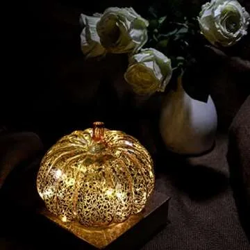 Show more Introducing the stunning Creative Pumpkin Design, a beautifully crafted decorative piece that stands at 5.5 inches in height and boasts a diameter of 6.4 inches. Made from high-quality glass, this pumpkin captures the essence of fall while adding an elegant touch to your home décor. Its innovative design features 10 LED lights nestled within, which create a magical twinkle reminiscent of stars in the night sky. Whether displayed on a table or a shelf, it is sure to attract attention and spark conversation.
