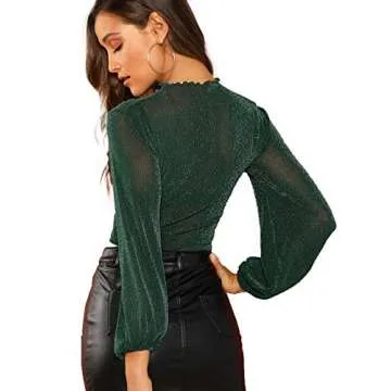 ROMWE Women's Bishop Sleeve Glitter Sexy Sheer Mesh Crop Blouse Top Green Medium