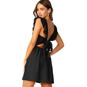 ROMWE Women's Cute Tie Back Ruffle Strap A-Line Flowy Short Dress in Black M