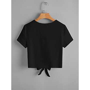 Romwe Women's Knot Front Cuffed Sleeve Striped Crop Top Tee T-Shirt Black Plain S