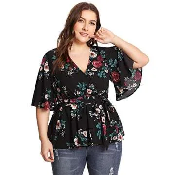 Show moreStep into a world of style and comfort with the ROMWE Women's Plus Size Floral Print Short/Long Sleeve Belt Tie Peplum Wrap Blouse Top. This beautifully designed blouse combines elegance and versatility, making it a wardrobe essential for the modern woman. Crafted from a soft and breathable fabric, this top features a stunning floral print that effortlessly enhances your feminine silhouette. The peplum cut flows gracefully, cinching you in at the waist to create a flattering shape that complements all body types. Choose between short or long sleeves to adapt to any season or occasion.