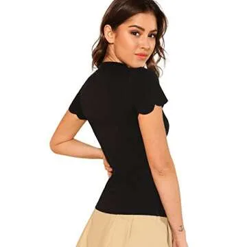 Show moreElevate your casual wardrobe with the gorgeous ROMWE Women's Scalloped Cut Out V Neck Short Sleeve Sexy Tee Tops. This stylish black tee features eye-catching scalloped cutouts that add an element of allure, while the V-neck design enhances your neckline beautifully. Perfect for both laid-back days and stylish nights out, this top is designed to provide ultimate comfort without sacrificing style. Crafted from premium, soft materials, it drapes elegantly on your figure, making it a versatile choice for any occasion. The short sleeves keep you cool and comfortable during the warmer months, and you’ll love how easily it pairs with jeans, skirts, or shorts.