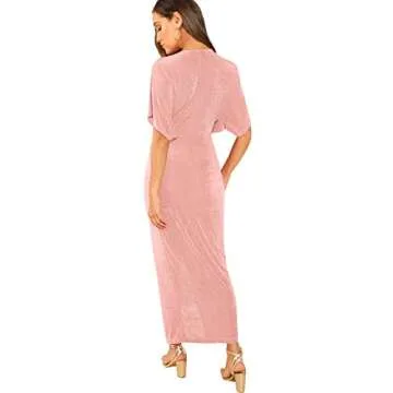 Show moreMake a dazzling entrance at any event with the Romwe Women's Twist Front Deep V Neck Split Hem Glitter Party Cocktail Dress. This stunning pink dress combines elegance and flair with its eye-catching glitter fabric that sparkles under every light. The deep V-neckline and twist front design create a silhouette that flatters and enhances your natural curves, while the alluring split hem adds a touch of drama to your look. Perfectly crafted for those who love to stand out, this dress is your go-to piece for cocktail parties, weddings, or any special occasion.