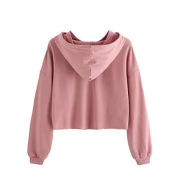 ROMWE Women's Women's Letter Print Sweatshirt Raw Hem Drawstring Crop Top Hoodie Pink# S