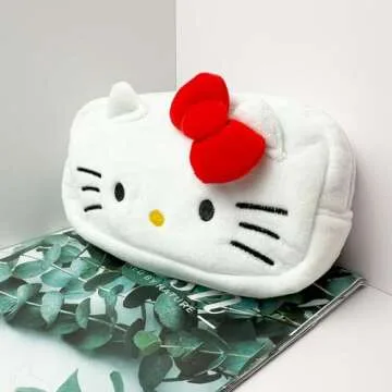 Rondlaho Kitty Travel Cosmetic Bag with Mirror, Large Capacity Cartoon Cosmetic Pouch Makeup Bag with Zipper, Plush Travel Toiletry Bag Makeup Accessories Organizer, Makeup Pouch for Women