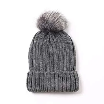 Roniky Womens Winter Beanie Hat, Silk Satin Lined Faux Fur Pom Pom Beanies Hat for Women Girls Warm Winter Knit Hats Deep Grey