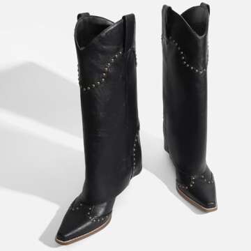 Show moreElevate your footwear game with the stunning RONILURN Women Shark Boots, designed to combine fashion, comfort, and sophistication. These unique fold-over mid-calf boots showcase an eye-catching snip toe silhouette that exudes a modern cowboy charm. Crafted with meticulous attention to detail, each pair features a robust and chic chunky heel for added height and stability, perfect for both casual outings and stylish events. The tasteful studded accents bring a touch of edge to your ensemble, making these boots a standout piece in any wardrobe. Whether you're a cowgirl at heart or just love a stylish boot, RONILURN has crafted a versatile piece that can transition effortlessly from day to night.