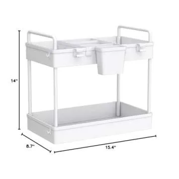 Show moreTransform your cluttered under-sink spaces into a beacon of organization with the Ronlap 2 Pack Under Sink Organizers and Storage. Crafted from durable, upgraded plastic, this two-tier organizer is designed to endure everyday use in your home, ensuring it stands the test of time while contributing to a sleek aesthetic. With its minimalist white design, these organizers not only optimize your storage but also blend beautifully into any decor, from bathrooms to kitchens.