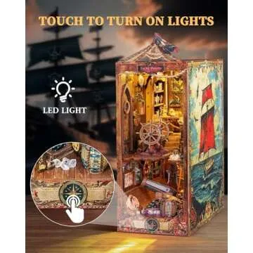 Show moreEmbark on an adventurous sea voyage with the RONSTONE DIY Book Nook Kit! This exquisite 3D wooden miniature puzzle brings the enchanting world of navigation into your own home. Featuring an intricate design of a vintage pirate ship equipped with various sailing tools, this kit invites you to dive deep into a realm of creativity and imagination. Measuring a delightful 10.63" x 7.72" x 2.36", it is structured not just as a beautiful decorative piece but also as a source of fun and pride once you assemble it. The cozy ambiance created by the embedded LED lighting accentuates its charm, making it an eye-catching addition to your bookshelf or office space.