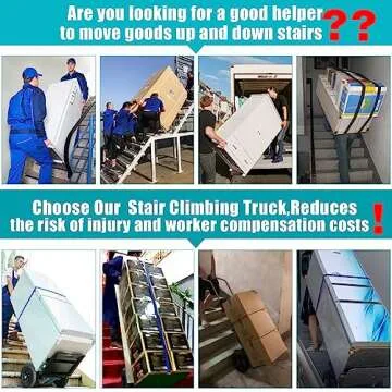 Show more The Electric Stair Climbing Hand Truck by ROOMEDAL is a revolutionary solution designed to ease the strenuous task of moving heavy goods up and down stairs. With its powerful 1200W motor, this innovative dolly can traverse stairs at a remarkable speed of 24-35 steps per minute, significantly reducing the effort required for stair climbing. The hand truck is not just a tool; it's an ergonomic assistant crafted to minimize back strain and lower worker compensation costs. Constructed to accommodate loads of up to 880 pounds, it is perfect for transporting bulky items such as refrigerators, TVs, and air conditioners efficiently.