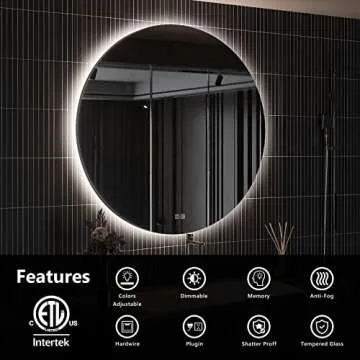 Show moreElevate your bathroom aesthetics with the ROOMTEC 28" LED Round Mirror—a masterpiece of modern design and functionality. This stunning wall-mounted mirror not only enhances your space but also offers impeccable utility with its dimmable LED lights. Easily adjustable from 10% to 100% brightness, this mirror allows you to tailor the lighting from a soft glow for a relaxing soak to a bright light perfect for makeup application or selfies. With a clever smart memory function, it remembers your last brightness setting, saving you the hassle of readjusting every time you use it.