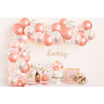Show more Transform any celebration into a spectacular event with the beautifully crafted Rose Gold Balloon Garland Kit. This eye-catching set includes a stunning array of 110 rose gold, white, and pink confetti balloons, expertly designed to add a hint of elegance and joy to every occasion. Whether you're decorating for a bridal shower, baby shower, engagement party, wedding, or birthday celebration, this set provides everything you need to create a remarkable balloon arch or garland.