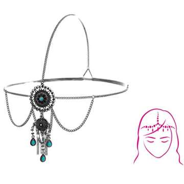 The head chain features a measured length of 11.5 inches across the top, complemented by two side chains measuring 6 inches each. All three chains elegantly connect to a stretchy black elastic band, ensuring a comfortable and secure fit for all head sizes. With two captivating centerpiece styles to choose from, you can personalize your look even further, making it not just an accessory but a reflection of your unique style. The double circle turquoise fringe decor offers a lavish 4-inch length, while the red and turquoise fan style decor provides a neat 1.5-inch length, both adding pops of color and vibrant personality to any outfit.