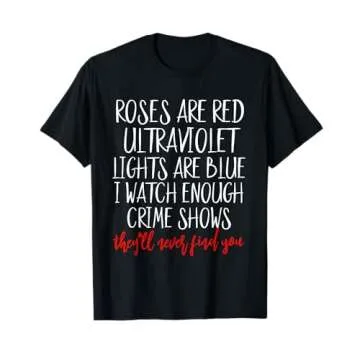 Show moreGet ready to embrace the spooky season in style with this uniquely designed shirt, perfect for fans of crime documentaries! The Roses Are Red Ultraviolet Lights Are Blue t-shirt is more than just a piece of clothing; it's a clever nod to the true crime genre that fascinates so many. This fun and humorous apparel option features a catchy phrase that humorously states, 'I Watch Enough Crime Shows They'll Never Find You.' Whether you're binge-watching chill cold case files, engrossed in murder podcasts, or simply enjoying the thrill of being a self-proclaimed detective, this shirt is designed just for you.